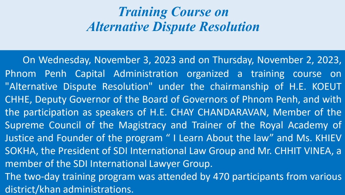 After serving as the Director of the SDI International Law Group for a period of time, Mrs. Khiev Sokha transferred the role of Director to Mr. Chan Sophea, who will now serve as the Director of the SDI International Law Group, as she will be returning to work at the Phnom Penh Appellate Court.